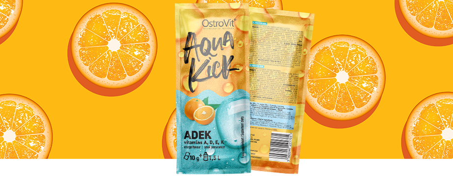 OstroVit Aqua Kick ADEK je doplnok stravy, ktorý poskytuje zdroj vitamínov rozpustných v tukoch, ako sú vitamín A, vitamín D a vitamín E a K. Je to moderný prípravok s jedinečnou pomarančovou príchuťou, ktorý je dostupný v praktickom vrecúšku. Je to výrobok určený pre fyzicky aktívnych ľudí, ktorý umožňuje plynulý prísun cenných mikroživín.
