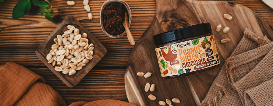OstroVit Peanut Butter Chocolate + Hazelnut in Caramel je lahodný krém na sendviče, palacinky a dezerty s jedinečným zložením. Náš krém je kombináciou pražených arašidov a karamelizovaných lieskových orieškov s viackvetým medom, MCT olejom z kokosového oleja, kakaom, prírodnou čokoládovou arómou a soľou, ktorá dodáva zloženiu jedinečnú slanú chuť. Hľadáte zdravý orechový krém, ktorý chutí skvele a neobsahuje konzervačné látky? OstroVit Peanut Butter Chocolate + Hazelnut in Caramel je produkt pre vás!