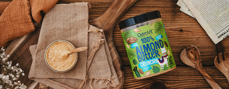 OstroVit 100% mandľové maslo je lahodný krém z mandlí, ktorý poskytuje m.na stránke. zdroj bielkovín a esenciálnych mastných kyselín (EFA). Neobsahuje žiadny pridaný cukor ani soľ a vďaka svojej jedinečnej chuti je ideálny do sladkých aj slaných jedál. Tento produkt sa odporúča najmä ľuďom, ktorí sa starajú o štíhlu postavu, ako aj športovcom.