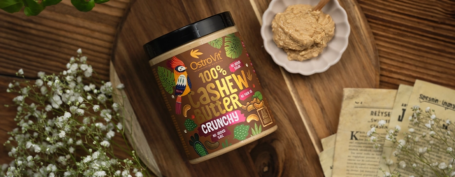 OstroVit 100% kešu maslo je vynikajúci a jedinečný produkt, vytvorený pre najnáročnejších gurmánov, ale aj pre ľudí, ktorí dbajú o štíhlu postavu, športujú a obmedzujú škodlivý nadbytok soli alebo cukru v strave. Hlboká, plná chuť kešu orechov sa dokonale hodí ako sladká a slaná príloha. Je to skutočná bomba cenných mastných kyselín, bielkovín a minerálov. Hĺbka chuti, 100% spokojnosť a záruka najvyššej kvality - OstroVit 100% kešu maslo.