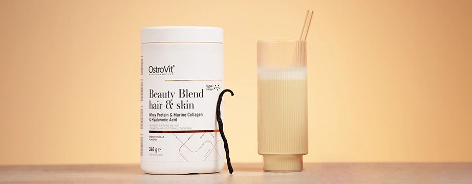 OstroVit Beauty Blend Hair & Skin je komplexný doplnok stravy, ktorý je zdrojom bielkovín a obsahuje aj kolagén, kyselinu hyalurónovú, vitamín C, vitamín A, zinok a biotín. Je to prípravok s lahodnou vanilkovou príchuťou, ktorý je dostupný v pohodlnej forme prášku. Je to výrobok bez pridaného cukru, ktorý je skvelý na doplnenie stravy ľudí, ktorí chcú vyzerať zdravo a krásne.